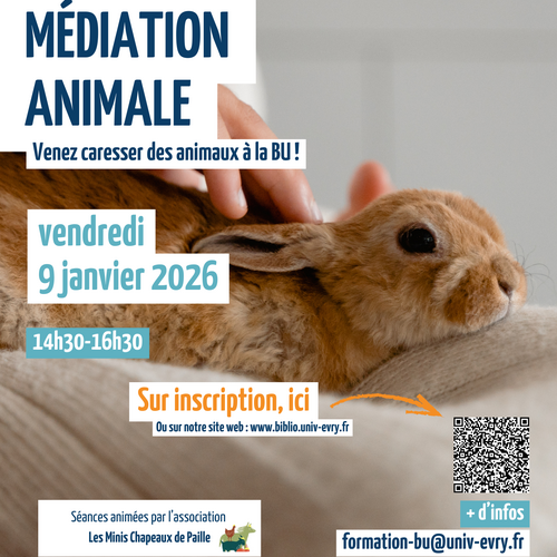 La Bibliothèque Universitaire de l'Université Évry Paris-Saclay propose aux étudiant·es une session de découverte à la médiation animale ! Cette...