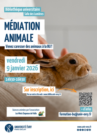 La Bibliothèque Universitaire de l'Université Évry Paris-Saclay propose aux étudiant·es une session de découverte à la médiation animale !