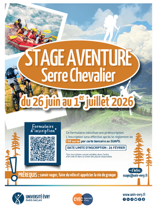 Le SUAPS organise le Stage Aventure, dans la vallée de Serre Chevalier, en montagne. Ce stage propose un programme riche en activités et en expériences, principalement centrées sur la pratique d’activités de montagne en été.