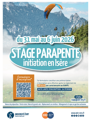 Le SUAPS propose un stage de parapente d’une durée de cinq jours, débutant le lundi matin. La formation est encadrée par les professionnels de Prévol, école de parapente labellisée FFVL et créée en 1986.