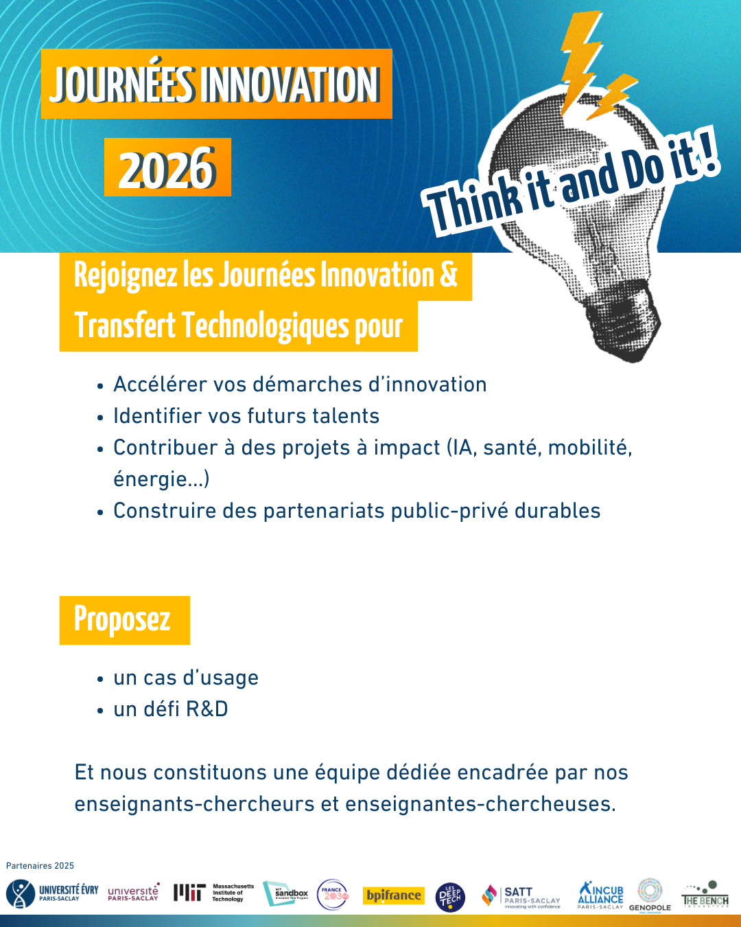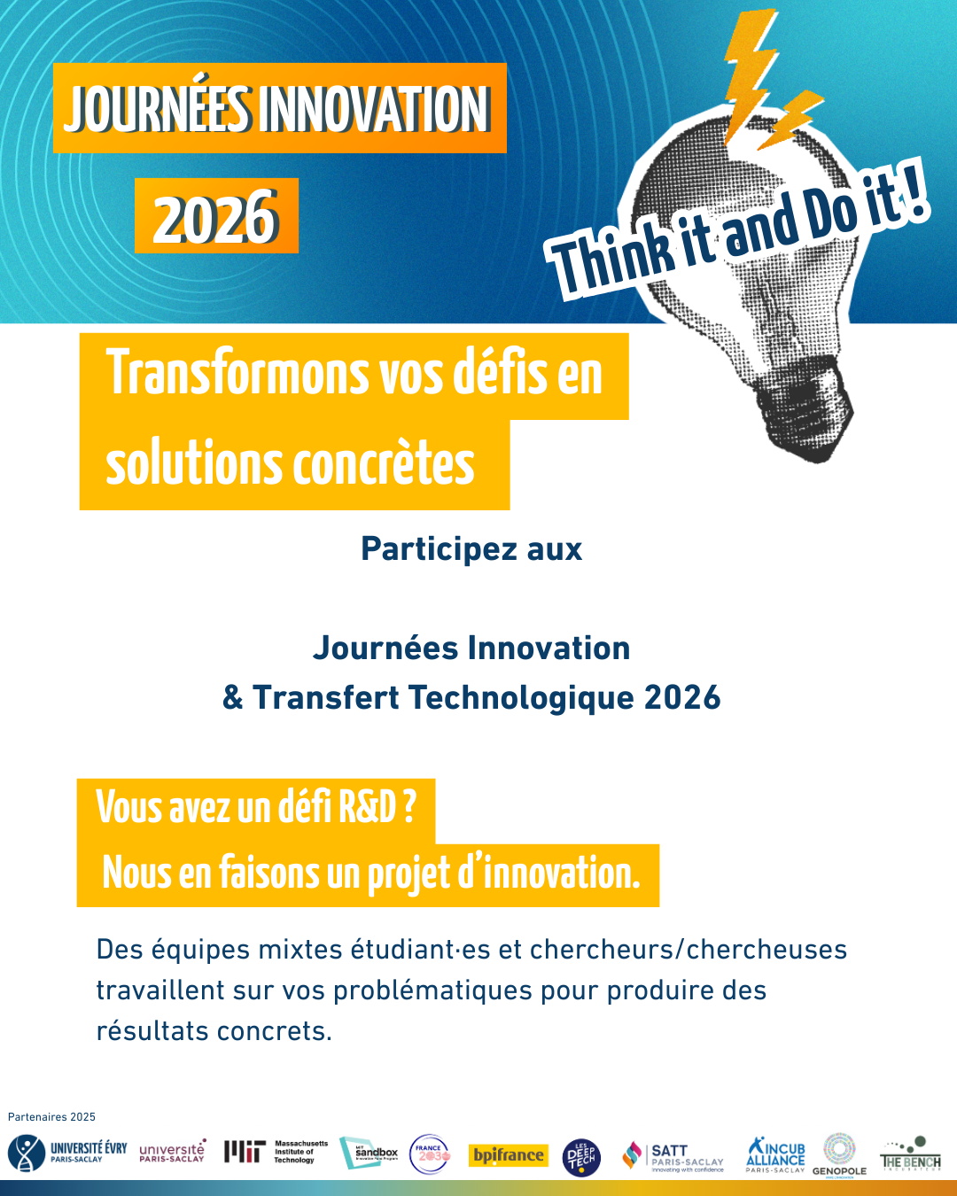 - Transformer vos enjeux industriels et R&D en projets d’innovation concrets, portés par des équipes mixtes étudiants–chercheurs.