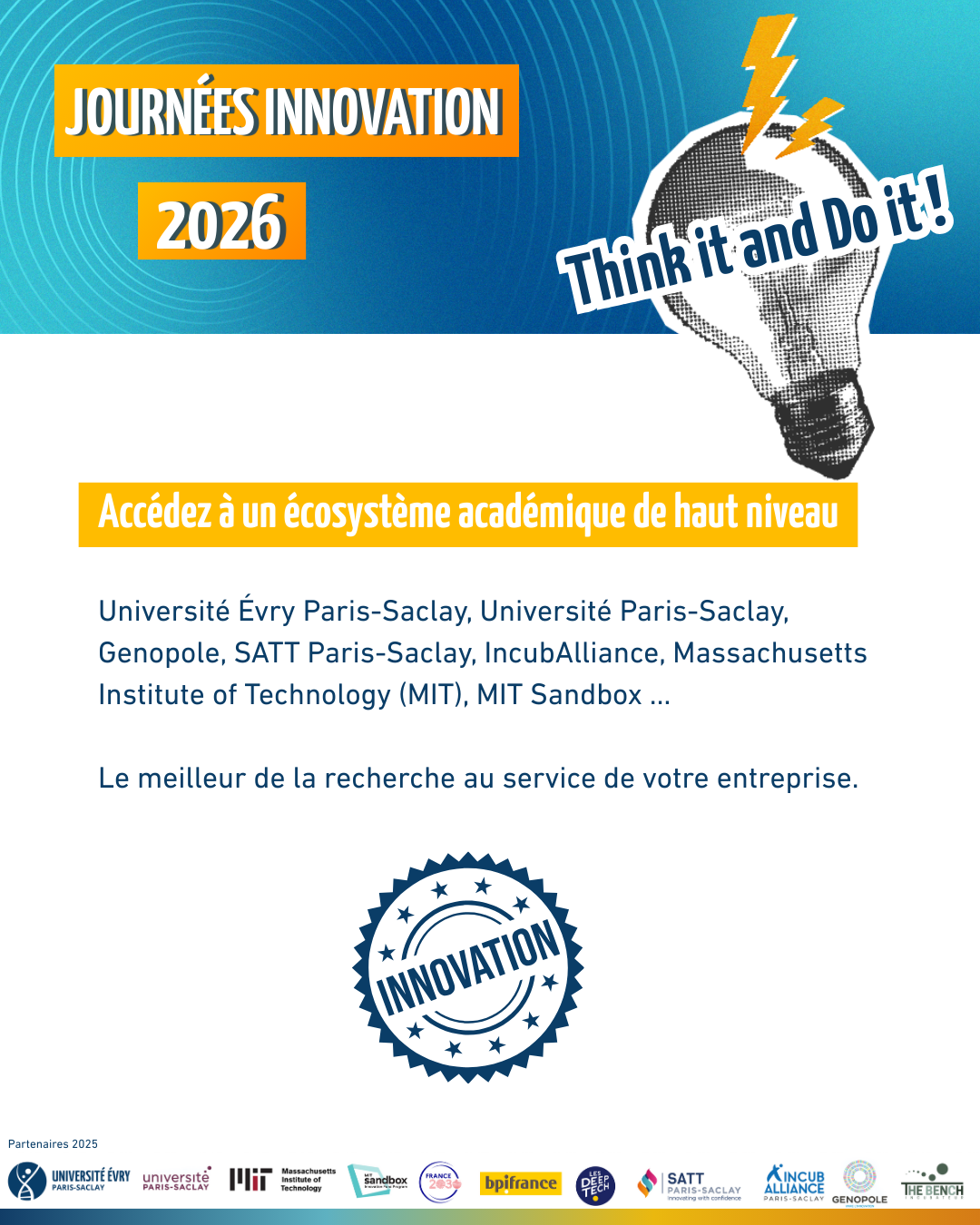 - Accéder à un écosystème académique de haut niveau (Université Évry Paris-Saclay, Université Paris-Saclay, Genopole, SATT Paris-Saclay, IncubAlliance, MIT, Sandbox, etc.).