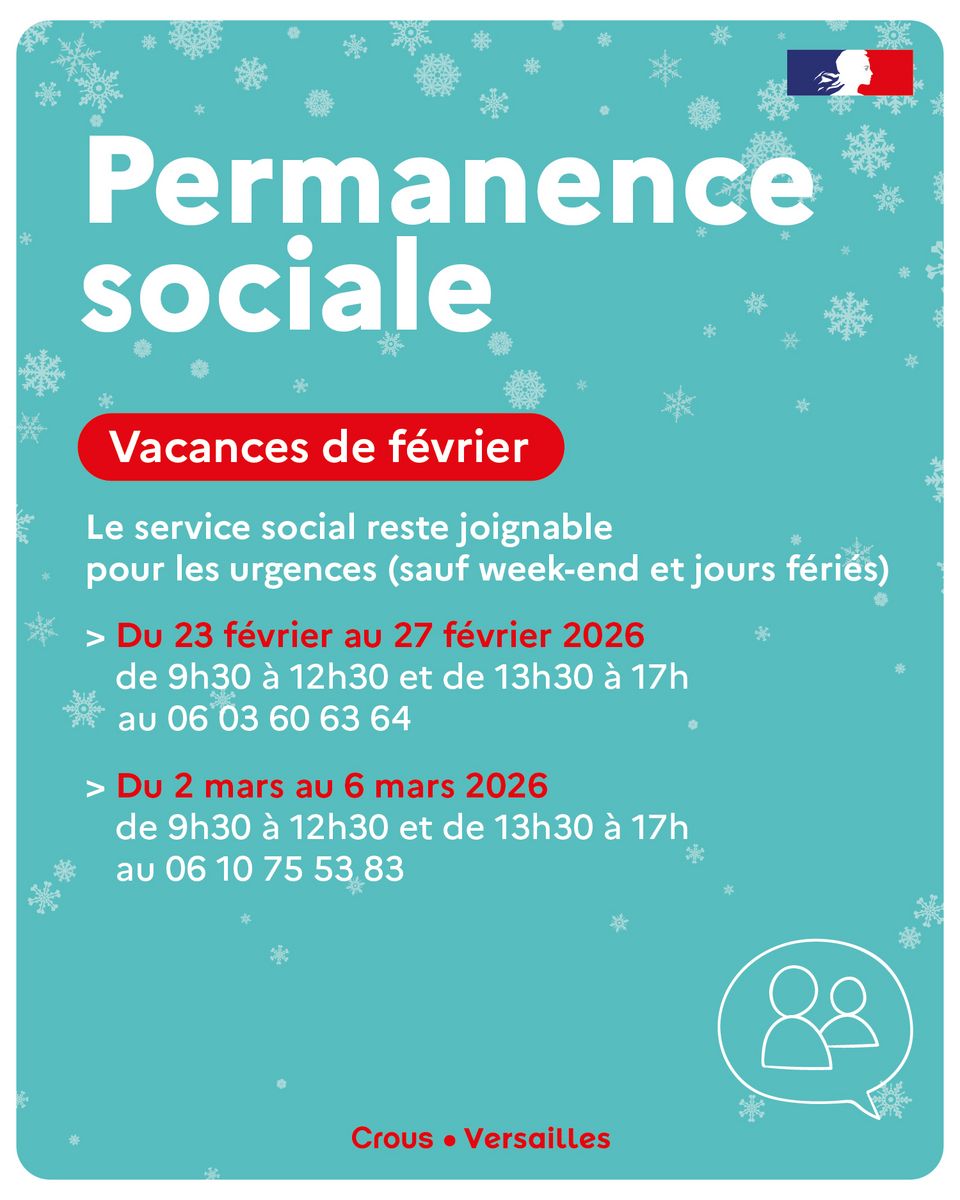 Durant les vacances, une permanence sociale du Crous est mise en place du 23 février au 6 mars 2026 pour accompagner les étudiant·es en situation d’urgence. Écoute, orientation et aide financière ponctuelle pourront être proposées.